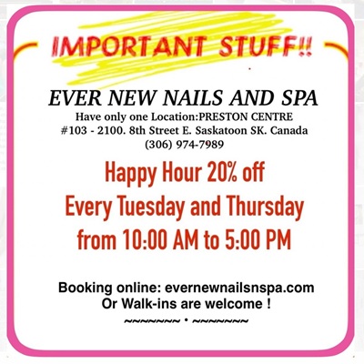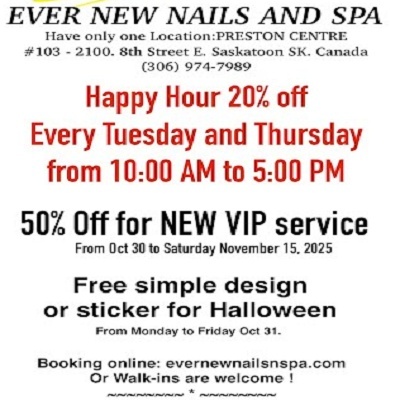 EVER NEW NAILS & SPA 2100 8 ST E #103,, SASKATOON, SK S7H 0V1 |